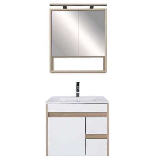 A fürdőszoba bútor tágas fiókokkal és felső szekrénnyel rendelkezik ahol kényelmesen elférnek a fürdőszobai pipere eszközök. Kompakt kialakítása miatt kisebb fürdőszobák berendezésére is alkalmas, például panel lakásokban. A termék magas minőségű bútorlapból készül és színben passzoló élzárókkal van ellátva. A fürdőszoba bútor felfüggesztett kivitelben kapható.