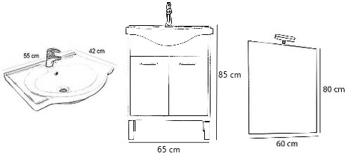A fürdőszobabútor kevés helyet foglal viszont tágas alsó és felső szekrénnyel rendelkezik ahol kényelmesen elférnek a fürdőszobai pipere eszközök. Kevés helyigénye miatt kisebb fürdőszobák berendezésére is alkalmas, például panel lakásokban. A termék magas minőségű bútorlapból készül és színben passzoló élzárókkal van ellátva. A fürdőszoba bútor mosdóval együtt kapható.