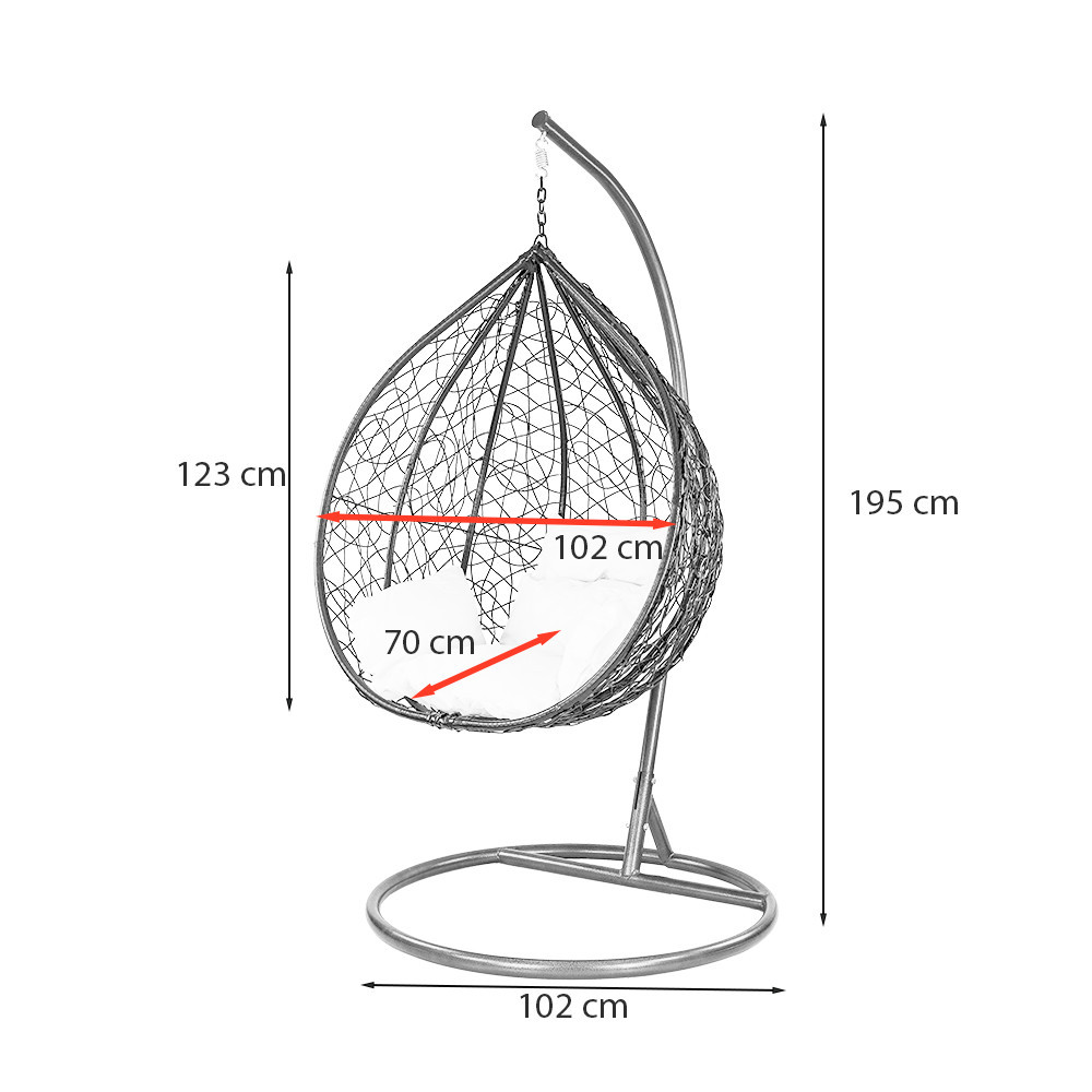 A fotel kétrészes, puha beige párnával van ellátva, amelyek kivehető, vízálló párnahuzattal rendelkezik, így könnyű a tisztítása. A 195 cm magas és 102 cm átmérőjű a váz szerkezet, míg a kosár 123 cm magas, 102 cm átmérőjű és 70 cm mélységű- komfortos helyet kínál a pihenéshez.