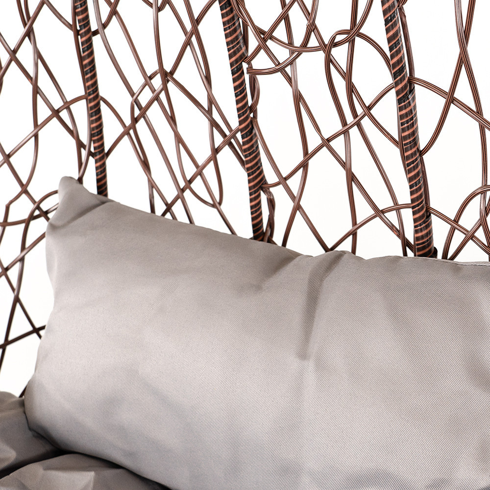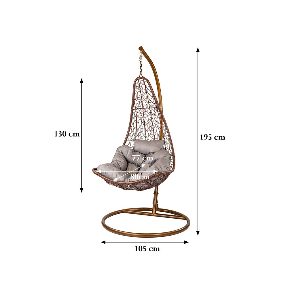 A kosár sűrű szövésű PE rattanból készül, amely az esztétitkai előnyök mellett, időjárásálló is. A barna színű rattan anyag ellenáll a szélsőséges időjárási körülményeknek, így a függőfotel hosszú távon is megőrzi szépségét.