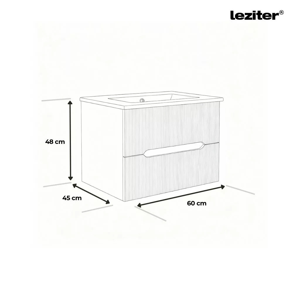 A Leziter Trent fürdőszobabútor harmonikusan ötvözi a látványt és a praktikumot. A bordázott előlap letisztult, modern karaktert ad, miközben az integrált fogantyú kényelmes használatot tesz lehetővé. A fali rögzítés könnyed megjelenést teremt, a padló takarítása pedig gyorsabbá válik. A kerámia mosdó tartós, időtálló, ellenáll a mindennapos igénybevételnek és egyszerűen tisztán tartható.
