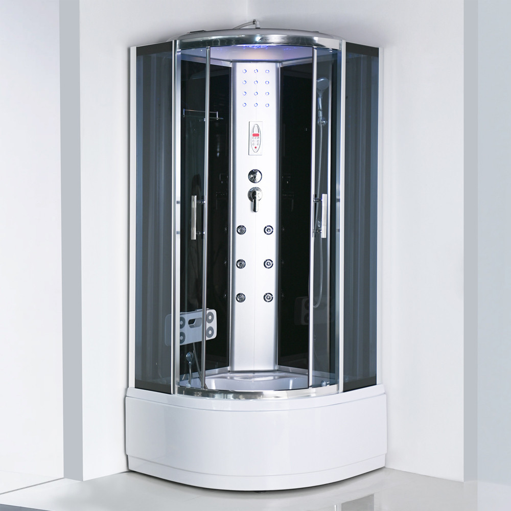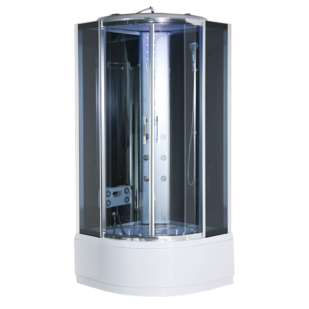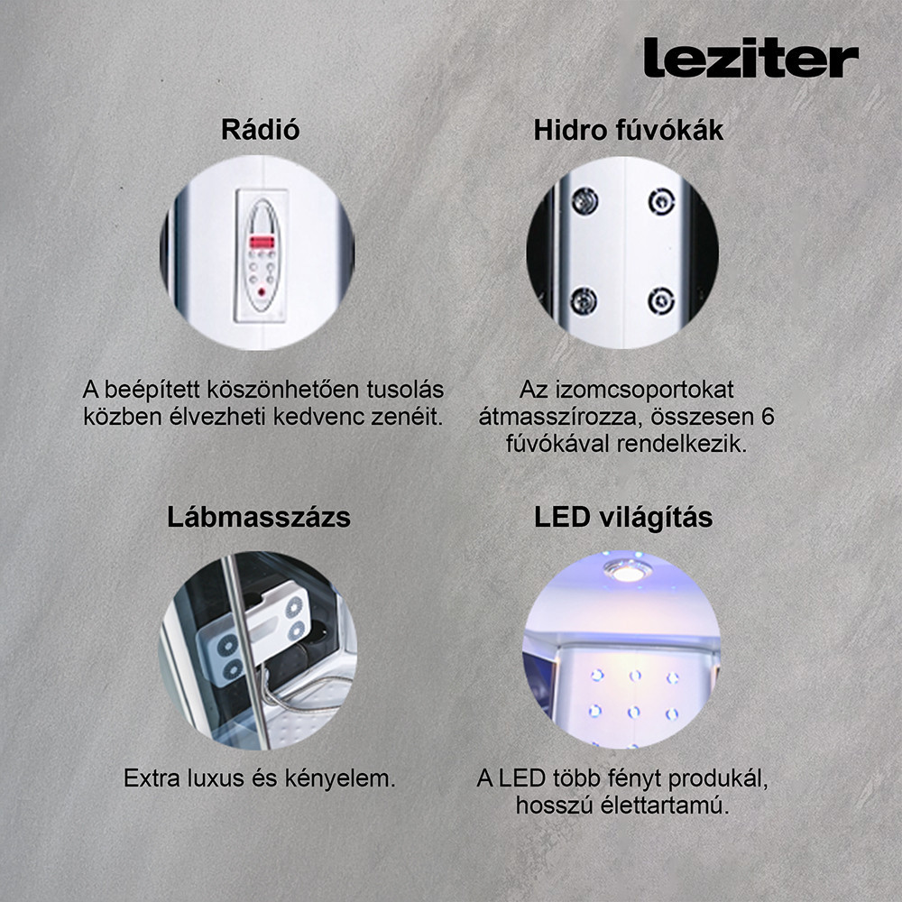 Zuhanykabin kényelmét fokozó eszközök: 6 hátmasszírozó fúvóka, alu hátsó panel, 2 zuhanyfej: esőztető fejzuhany, kézi zuhany, keverő csaptelep, funkcióválasztó kar, elektronika, kezelőpanel, rádió, hangszóró, hátsó és felső hangulatvilágítás, felső világítás, pipere polc, lábmasszírozó, ülőke.