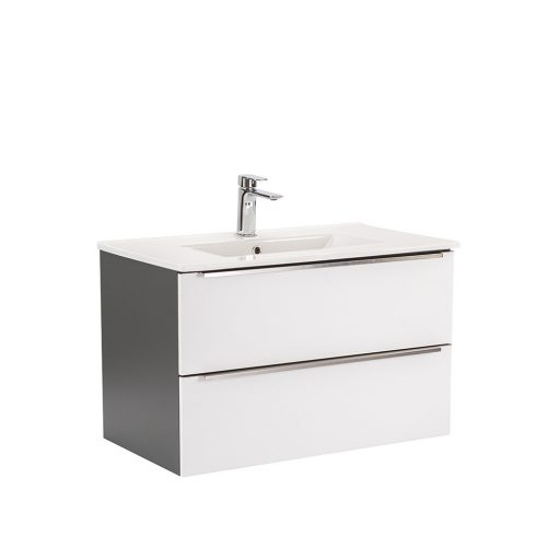 A Vario Trim 80 komplett fürdőszobabútor egy stílusos és praktikus választás modern fürdőszobához. Kompakt méretei ideálisak kisebb és közepes méretű fürdőszobákba is, és a fém fogantyú profil patinás hatást, az antracit-fehér színű dizájn elegáns megjelenést kölcsönöz a térnek. A csillapítós fiókzáródás és a felfüggesztett kivitel a kényelmet és könnyű tisztántartást szolgálja, míg a minőségi anyagok hosszú élettartamot biztosítanak.