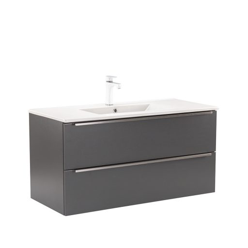 A Vario Trim 100 komplett fürdőszobabútor egy stílusos és praktikus választás modern fürdőszobához. Kompakt méretei ideálisak kisebb és közepes méretű fürdőszobákba is, és a fém fogantyú profil patinás hatást, az antracit-antracit színű dizájn elegáns megjelenést kölcsönöz a térnek. A csillapítós fiókzáródás és a felfüggesztett kivitel a kényelmet és könnyű tisztántartást szolgálja, míg a minőségi anyagok hosszú élettartamot biztosítanak.