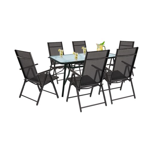A garnitúra tartalmaz egy téglalap alakú, 150x90 cm-es üvegasztalt, valamint hat Lugo összecsukható fémvázas kerti széket, amelyek 7 különböző pozícióba állíthatók, hogy a lehető legkényelmesebb ülést biztosítsák.