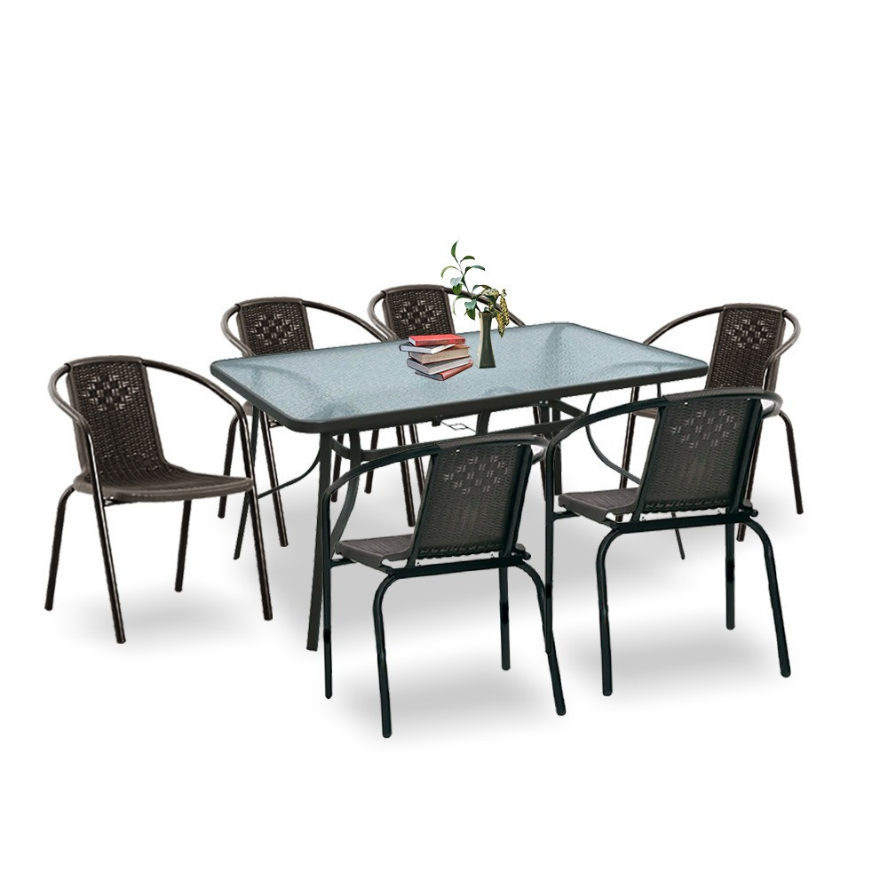 A modern kivitelű kerti bútorkészlet egy kerti üveglapos asztalt és 6 széket tartalmaz. A bútorokat 6 fő számára tervezték. A székek és az asztal lábazata fémből készül. Az asztallap 5 mm-es edzett üvegből készült, amely ellenáll a kisebb karcolásoknak. A műanyag szék ülésanyaga ellenáll az időjárási viszonyoknak. Előnye az ergonómikusan profilált ülés és karfa, amelyek tehermentesítik a vállakat pihenés közben.