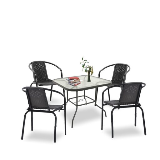A modern kivitelű kerti bútorkészlet egy kerti üveglapos asztalt és 4 széket tartalmaz. A bútorokat 4 fő számára tervezték. A székek és az asztal lábazata acélból készül. Az asztallap 5 mm-es edzett üvegből készült, amely ellenáll a kisebb karcolásoknak. A műanyag szék ülésanyaga ellenáll az időjárási viszonyoknak. Előnye az ergonómikusan profilált ülés és karfa, amelyek tehermentesítik a vállakat pihenés közben.