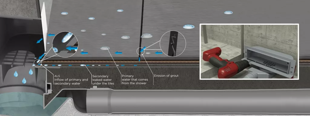 *ALS rendszer a Frameless Line, Slim Line és a Wall Drain modellek speciális tulajdonsága amely lehetővé teszi, hogy a csempék alól szivárgó vagy kondenzációs víz a lefolyóba kerüljön.
