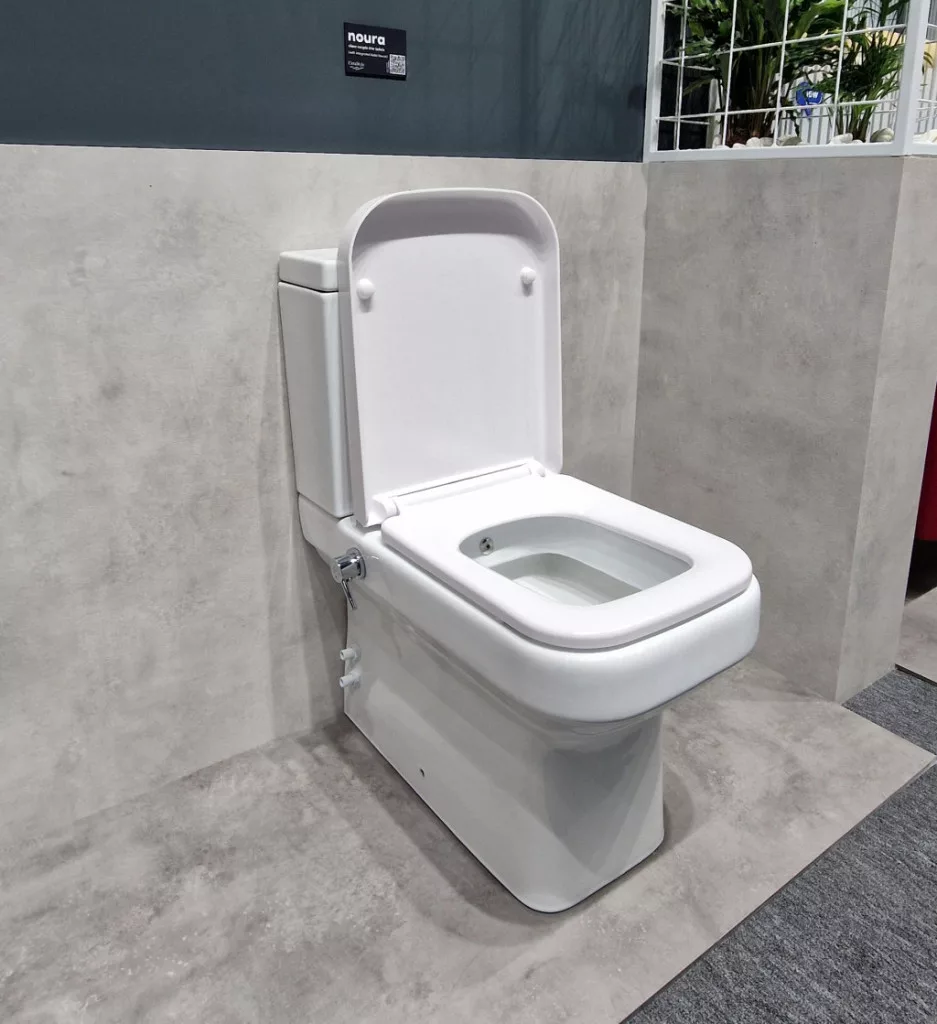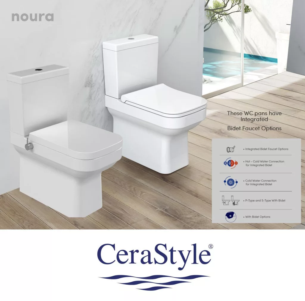 A CeraStyle NOURA monoblokk WC modern, BTW (back-to-wall), vagyis falig tolható változata kényelmes és higiénikus megoldást kínál minden fürdőszobába. A beépített bidé funkciónak köszönhetően egyesíti a WC és a bidé előnyeit, így különösen ideális választás kisebb helyiségekbe vagy a maximális komfortot kereső vásárlóknak.