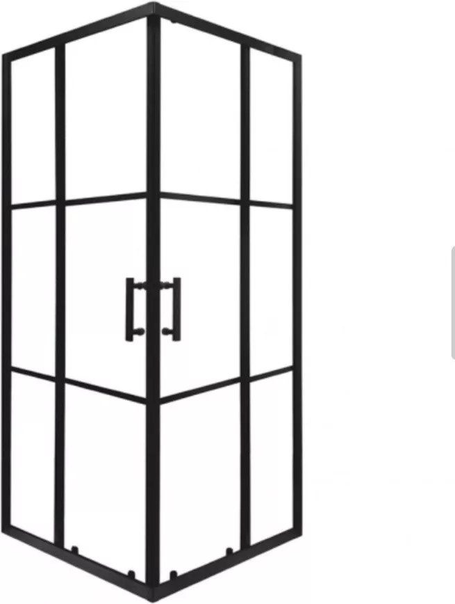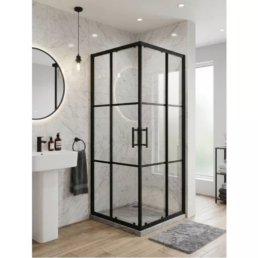 - Modern design: a fekete keret és a geometrikus üvegosztások a legújabb fürdőszobai trendeket követik.
